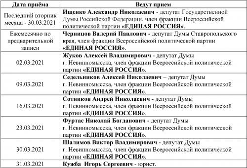 График приема граждан на март 2021 года в общественной приемной партии «ЕДИНАЯ РОССИЯ»